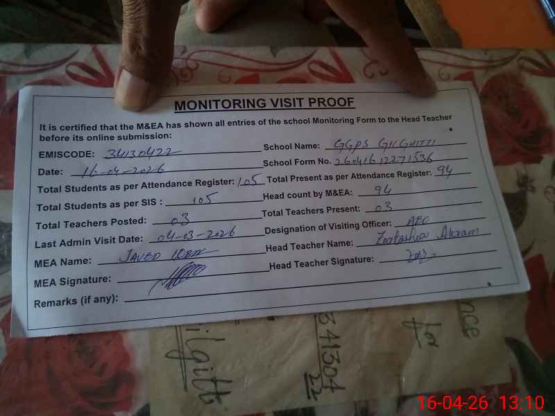 | EMIS Code: 34130422 | Name of School: GGPS GILGHITTI | |||