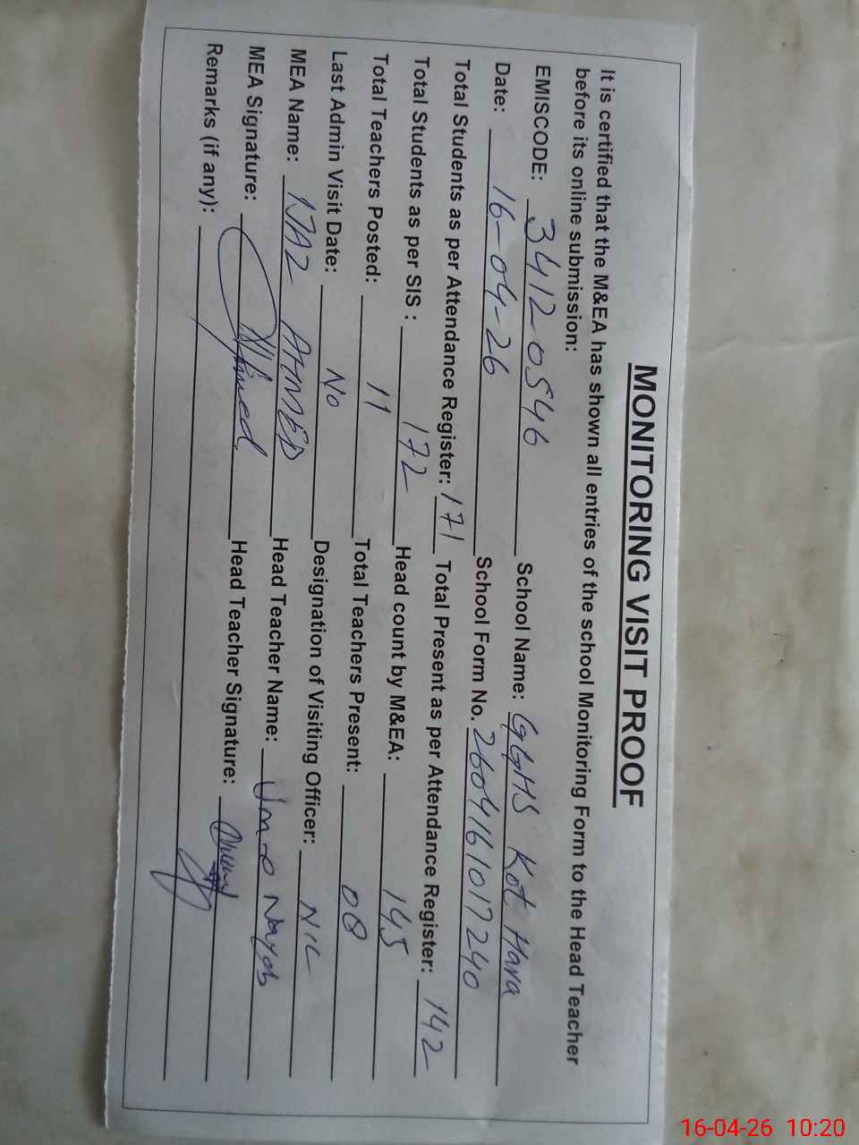 | EMIS Code: 34120546 | Name of School: GGHS KOT HARA | |||