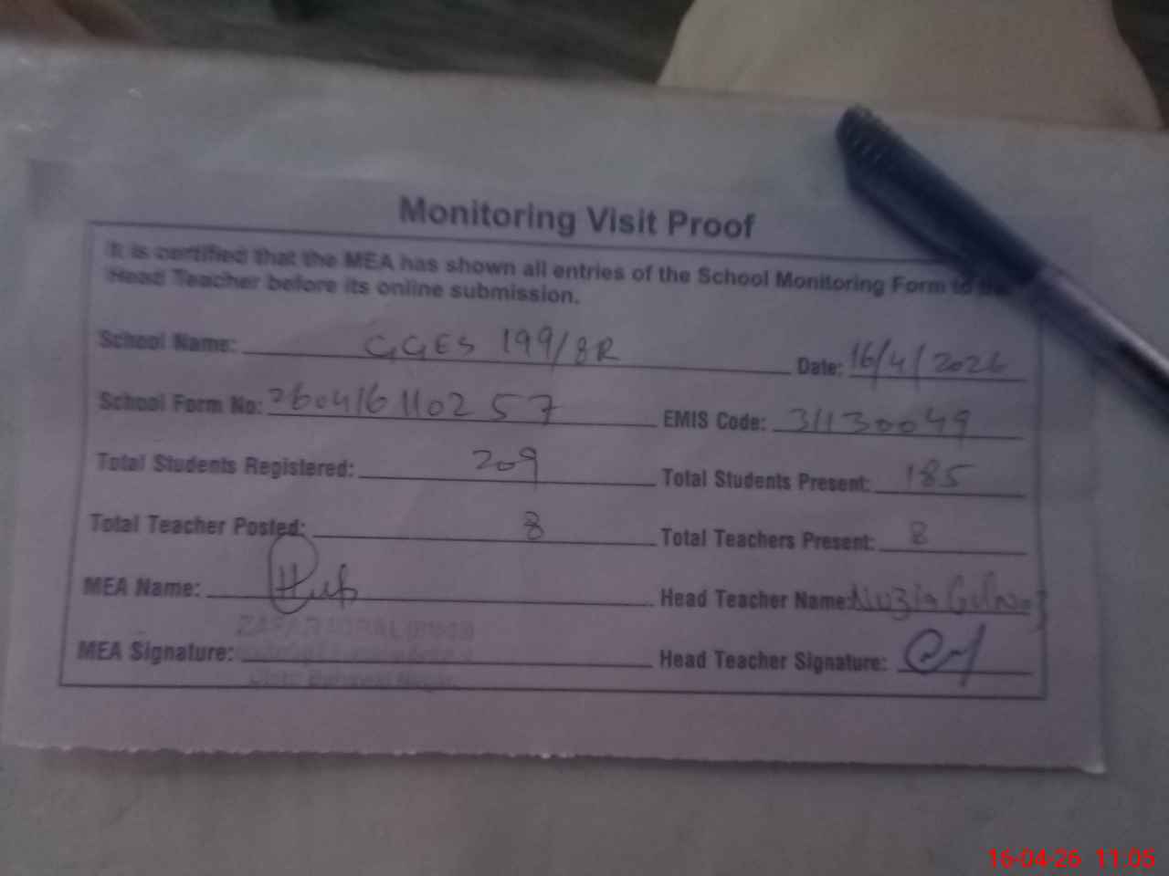 | Attendance Register | Head Teacher | MEA with School | Visit Proof |