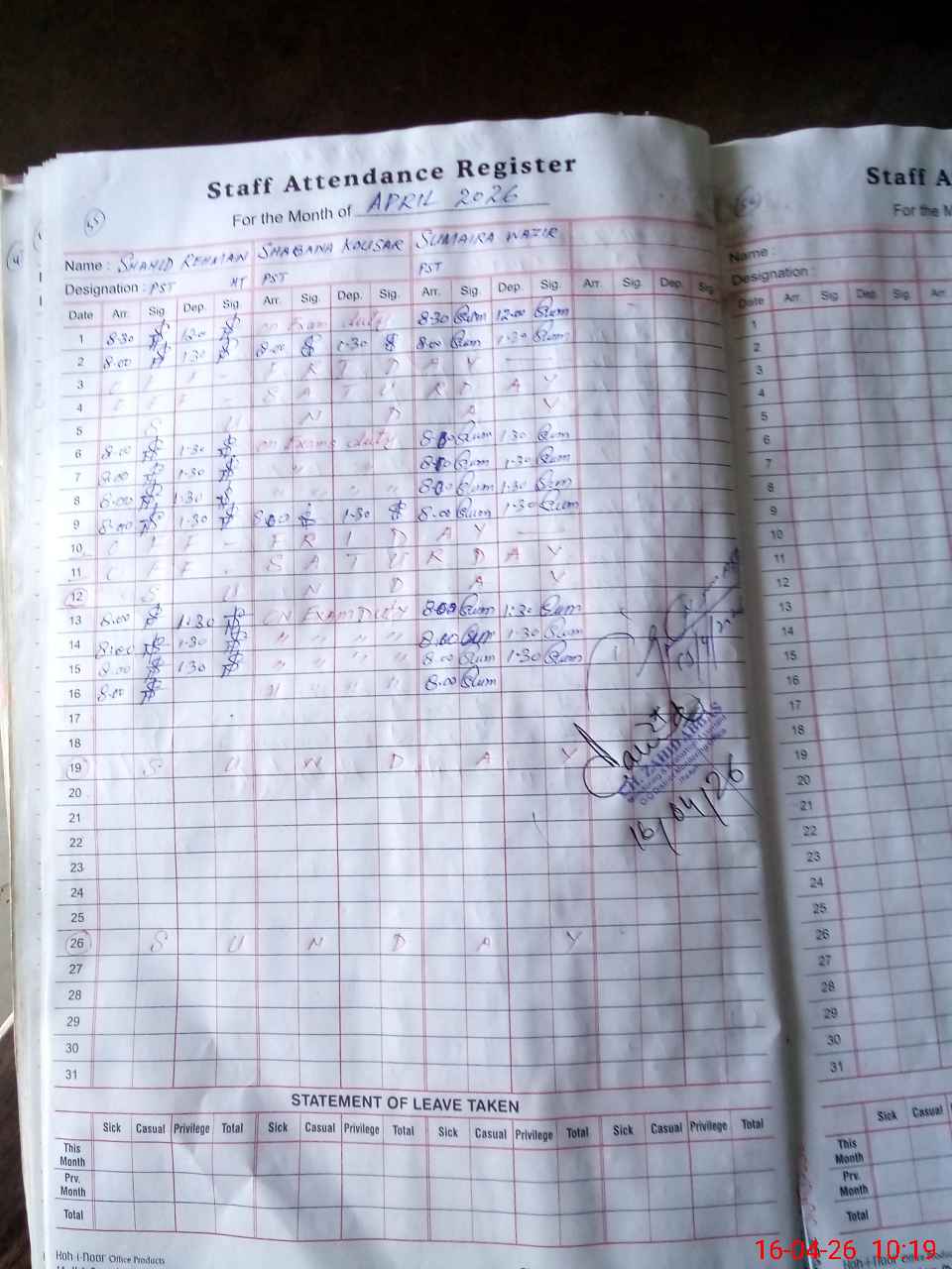 | 37**** | Sh**** Ko**** | PST Science/Maths | Regular | 0 | 0 | 0 | 0 | 0 | 0 | 0 | 0 | 0 | Absent (Un-Authorized) |