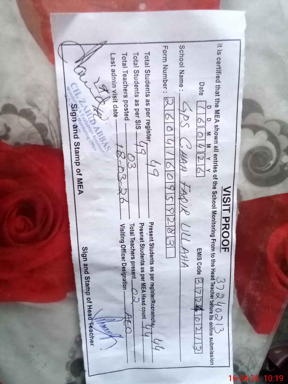 | EMIS Code: 37240213 | Name of School: GPS CHAH FAQIR ULLAHA | |||