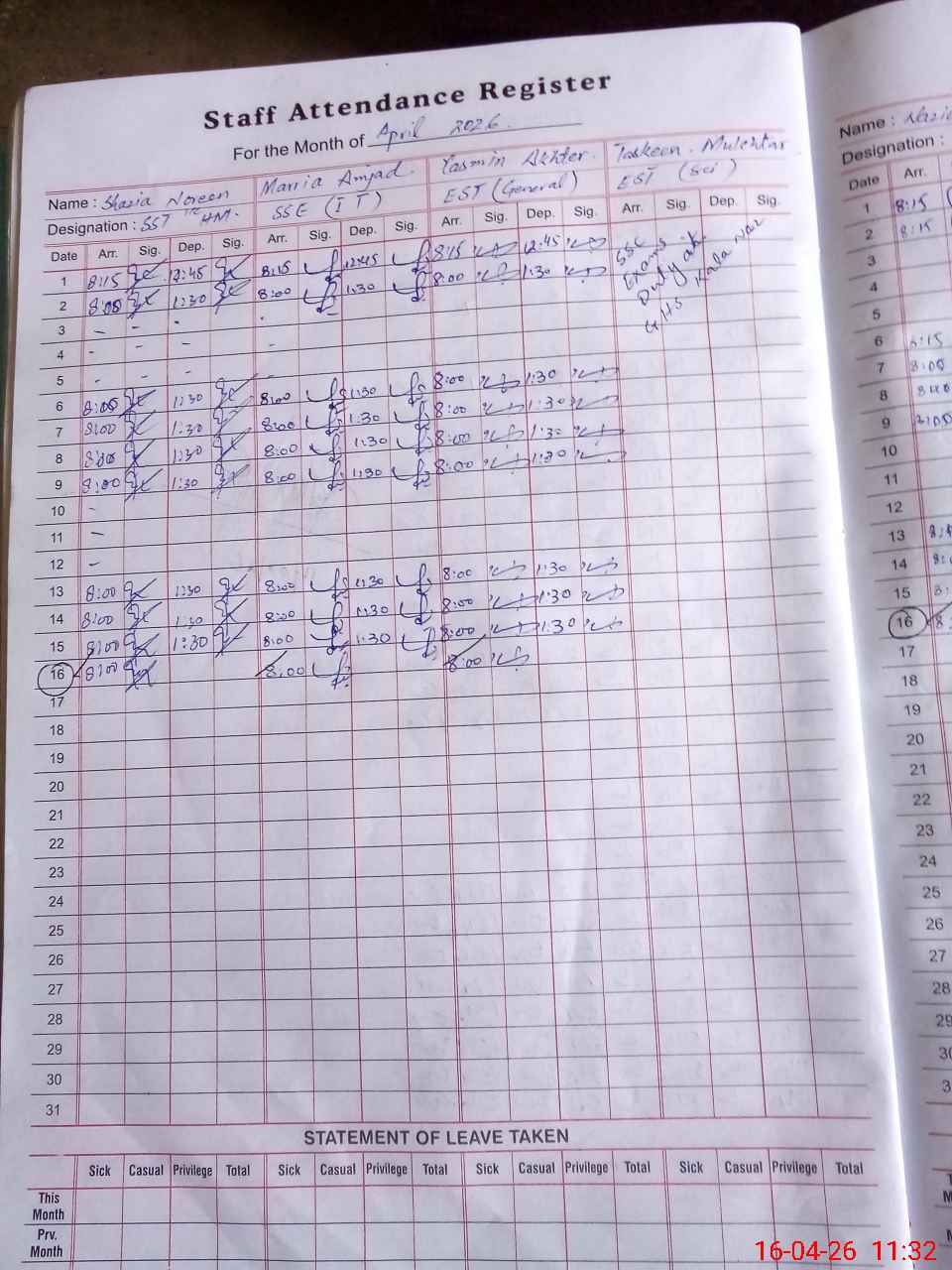 | 37**** | Ta**** Ak**** | EST Arabic | Regular | 0 | 0 | 20 | 0 | 0 | 0 | 0 | 0 | 0 | Absent (Un-Authorized) |