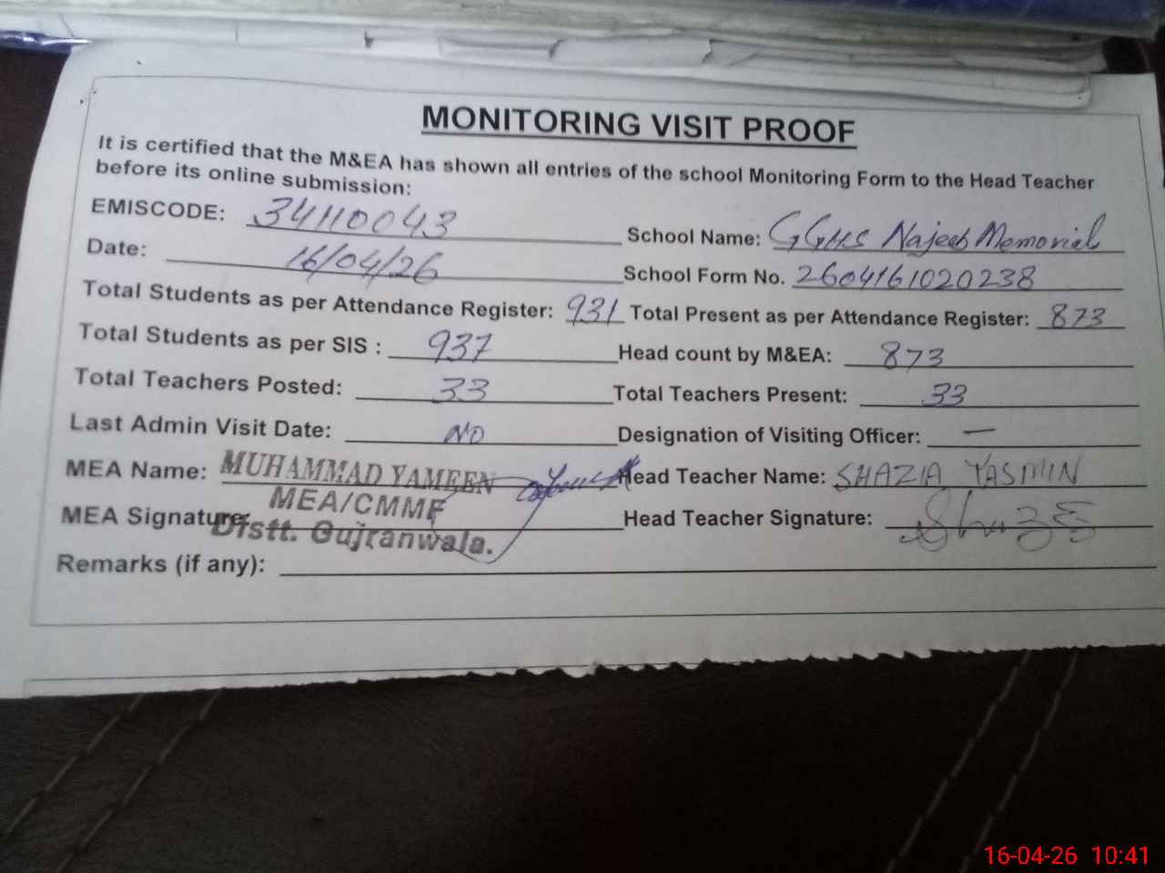 | EMIS Code: 34110043 | Name of School: GGHS NAJEEB MEMORIAL GUJRANWALA | |||