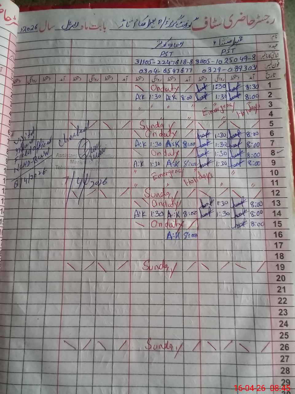| CNIC | Full Name | Designation | R/C | Absence During Last Calender Month |