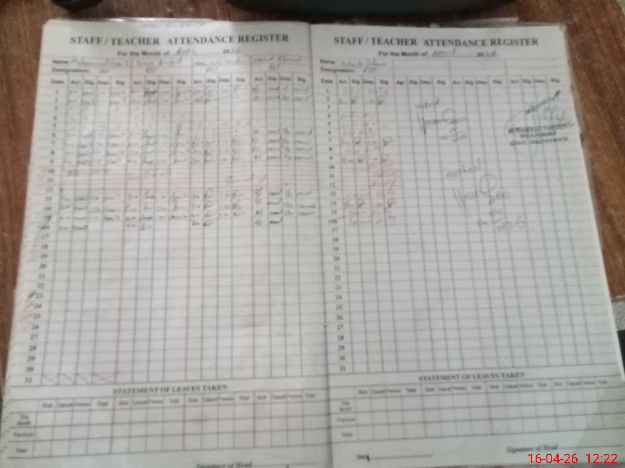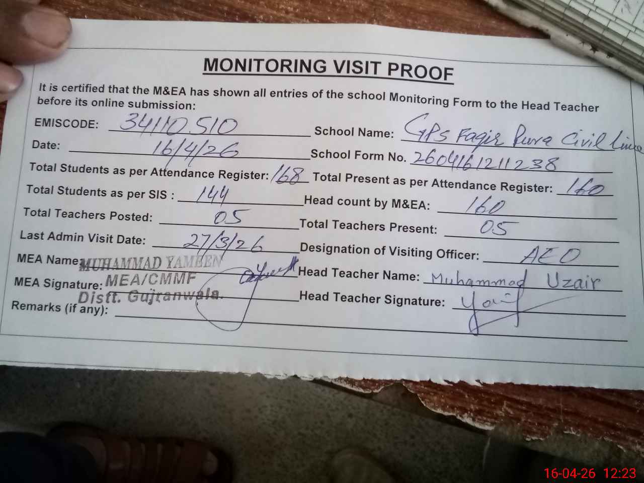 | Attendance Register | Head Teacher | MEA with School | Visit Proof |