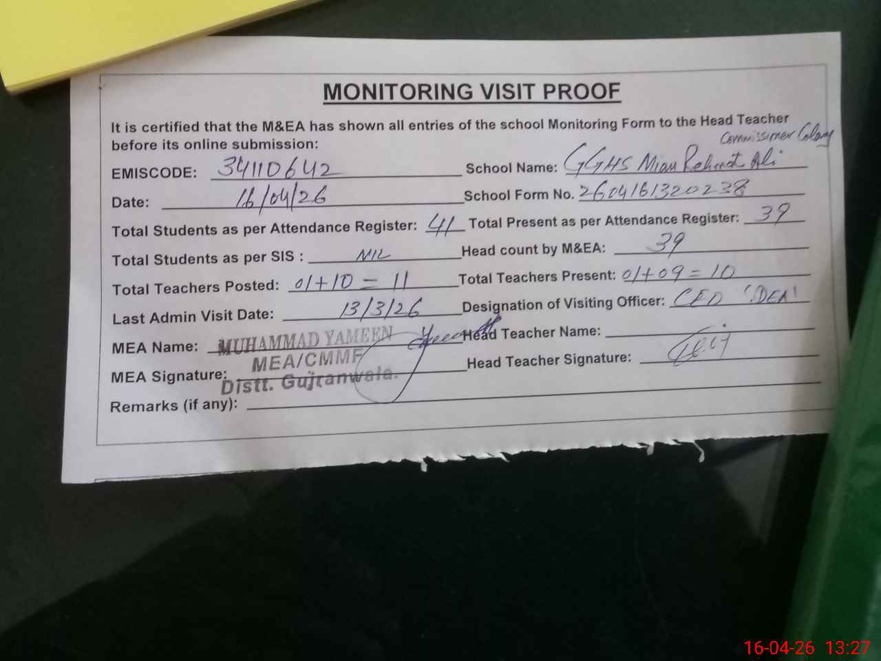 | Attendance Register | Head Teacher | MEA with School | Visit Proof |
