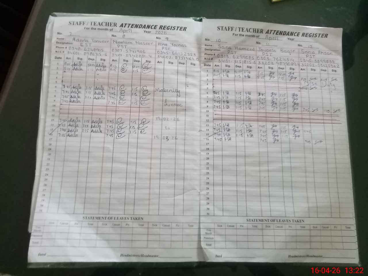 | CNIC | Full Name | Designation | R/C | Absence During Last Calender Month |