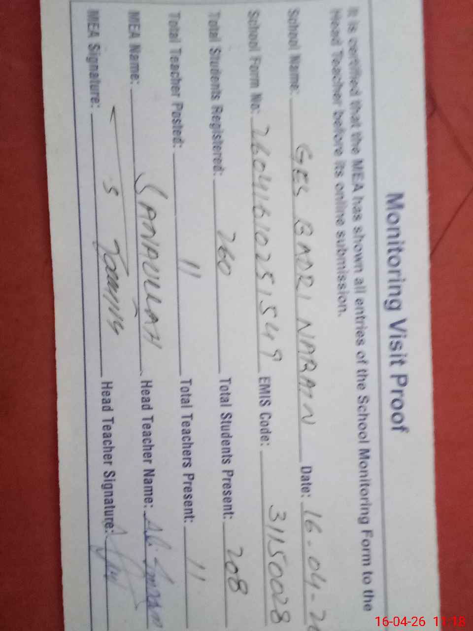 | Attendance Register | Head Teacher | MEA with School | Visit Proof |