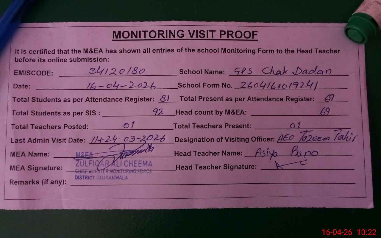 | EMIS Code: 34120180 | Name of School: GPS CHAK DADAN | |||