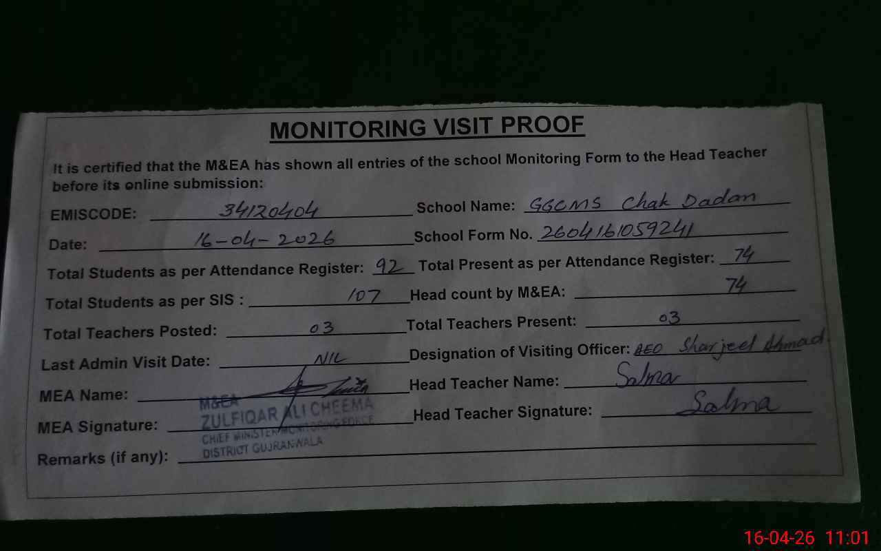 | EMIS Code: 34120404 | Name of School: GGCMS CHAK DADAN | |||