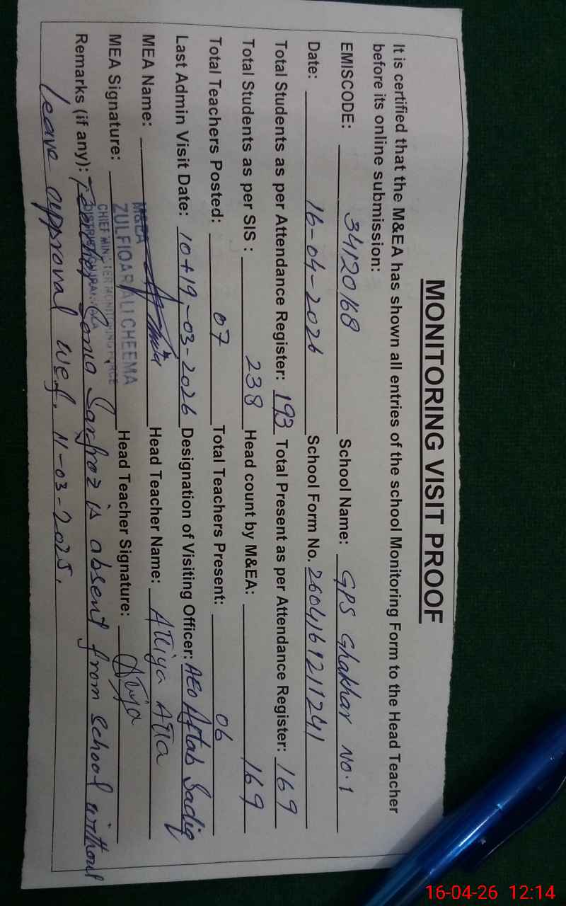 | EMIS Code: 34120168 | Name of School: GPS GHAKHAR NO.1 | |||