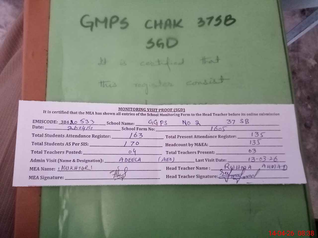 | Attendance Register | Head Teacher | MEA with School | Visit Proof |