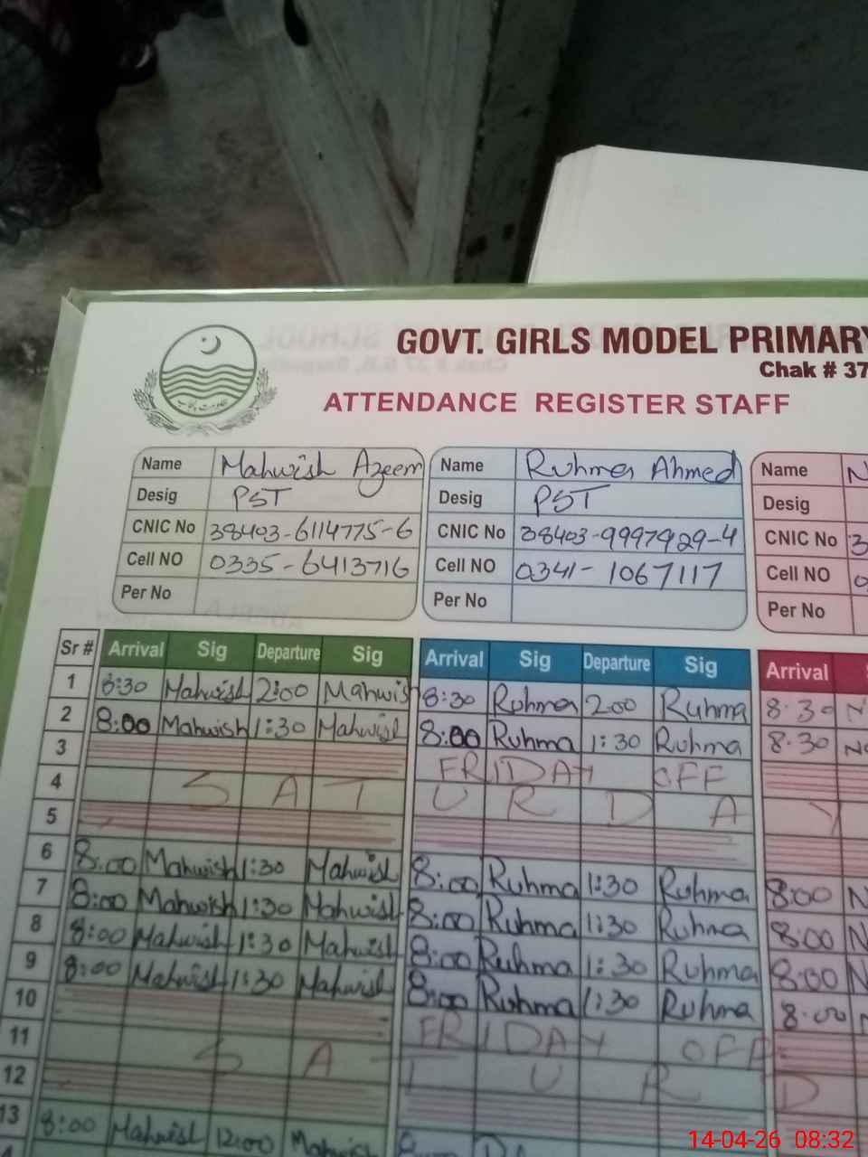 | CNIC | Full Name | Designation | R/C | Absence During Last Calender Month |