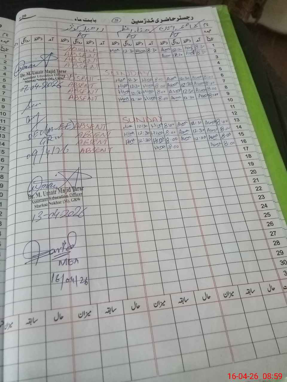 | 34**** | Ra**** Ka**** | PST Science/Maths | Regular | 0 | 0 | 31 | 0 | 0 | 0 | 0 | 0 | 0 | Absent (Un-Authorized) |