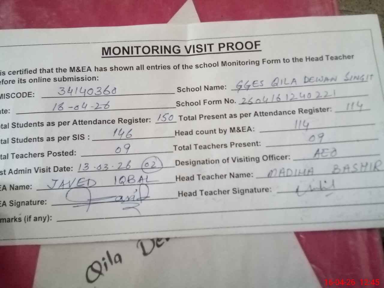 | Attendance Register | Head Teacher | MEA with School | Visit Proof |