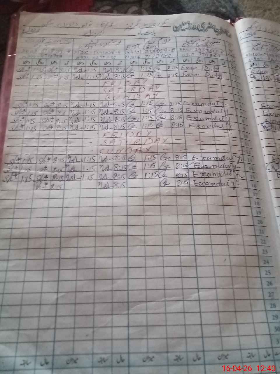 | Leave | Duty | Absent | Maternity | Medical | Ex- Pak |
