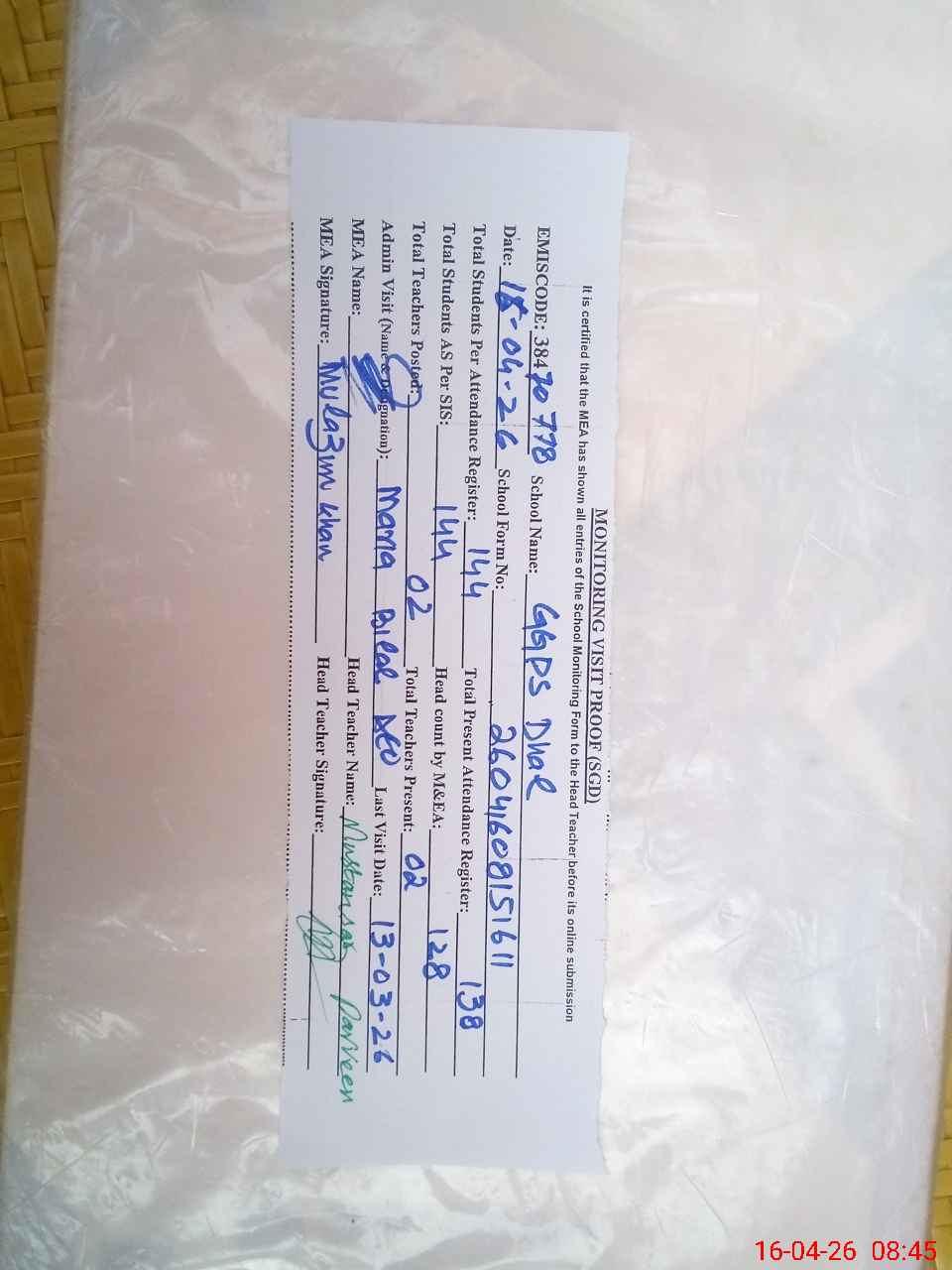 | Attendance Register | Head Teacher | MEA with School | Visit Proof |