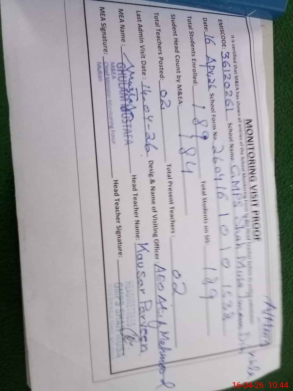 | Attendance Register | Head Teacher | MEA with School | Visit Proof |