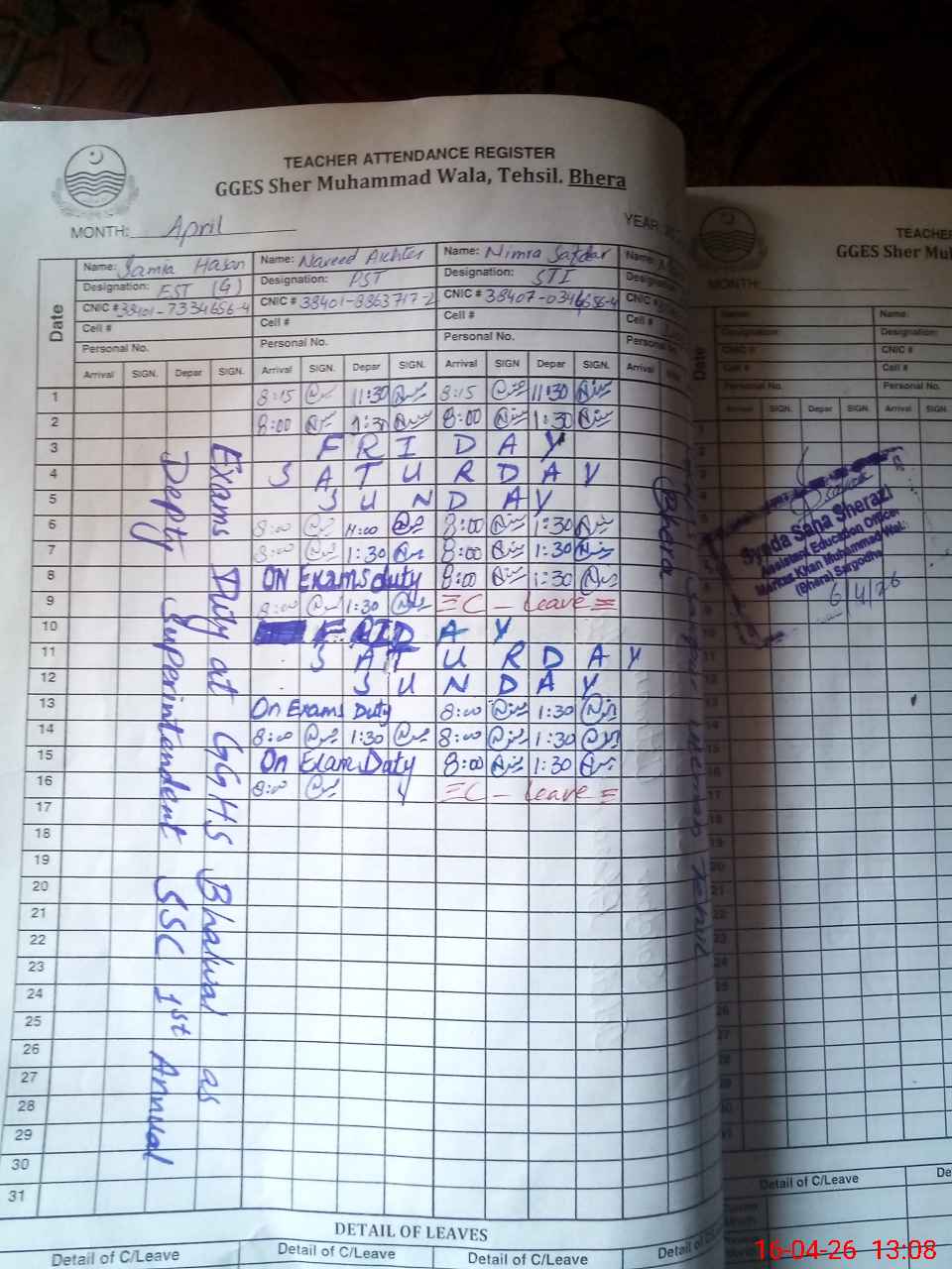 | CNIC | Full Name | Designation | R/C | Absence During Last Calender Month |