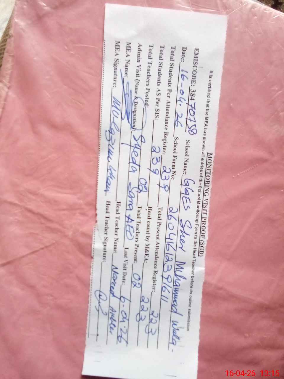| Attendance Register | Head Teacher | MEA with School | Visit Proof |
