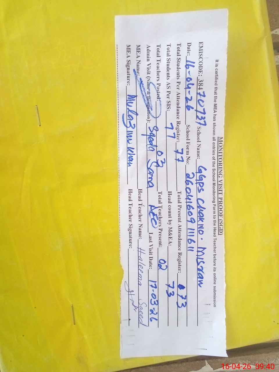 | Attendance Register | Head Teacher | MEA with School | Visit Proof |