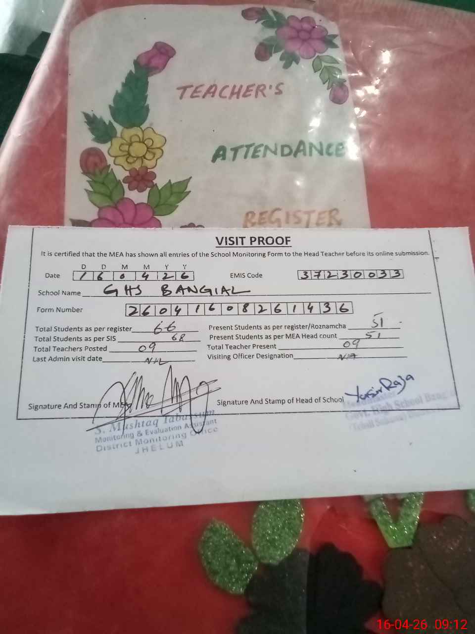 | Attendance Register | Head Teacher | MEA with School | Visit Proof |
