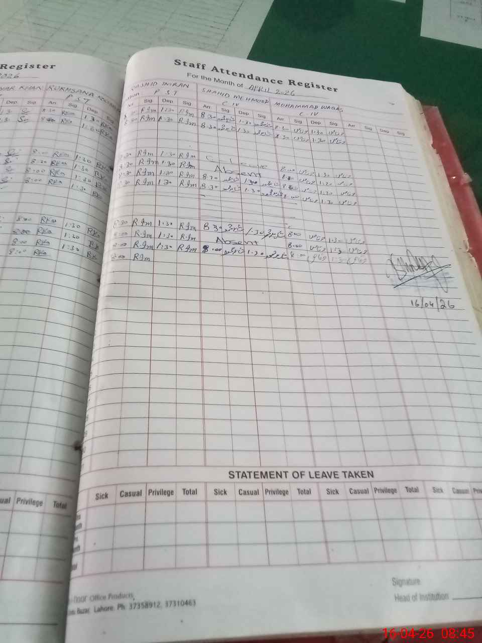 | Remarks (Use Separate Page if Required): No admin visit for last month. Shahid Mehmood and Muhammad Waqas C IV both were absent. Both came in school after 9AM. | |||||