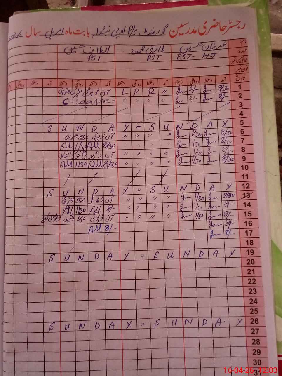 | CNIC | Full Name | Designation | R/C | Absence During Last Calender Month |