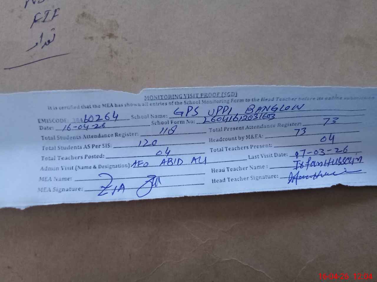 | Attendance Register | Head Teacher | MEA with School | Visit Proof |