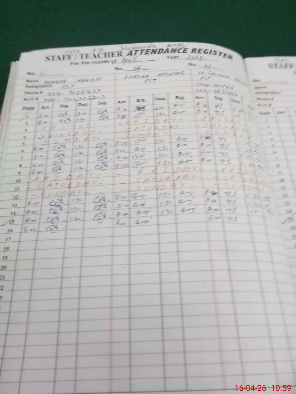 | CNIC | Full Name | Designation | R/C | Absence During Last Calender Month |