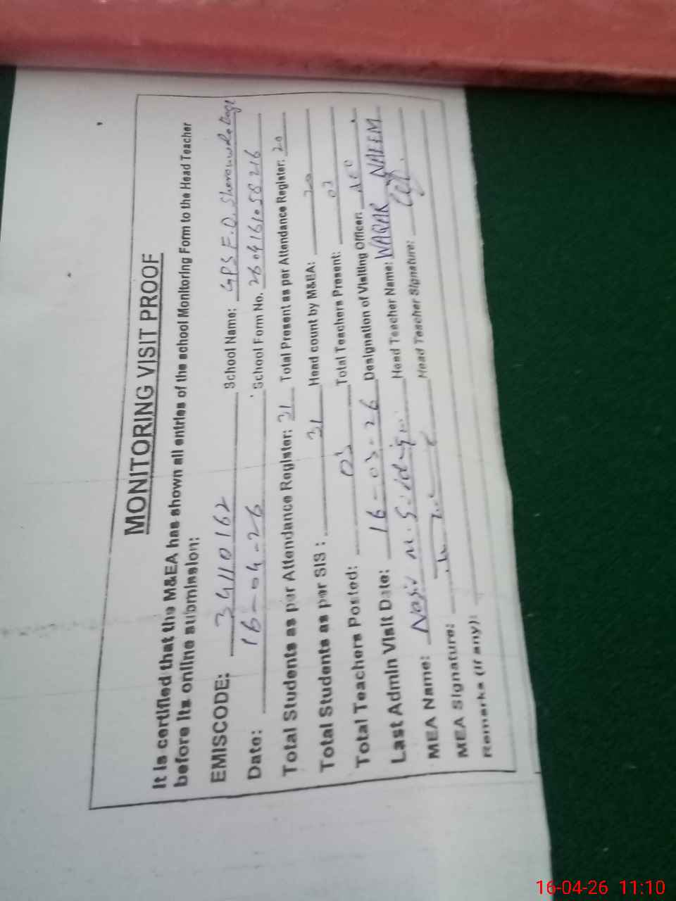 | Attendance Register | Head Teacher | MEA with School | Visit Proof |