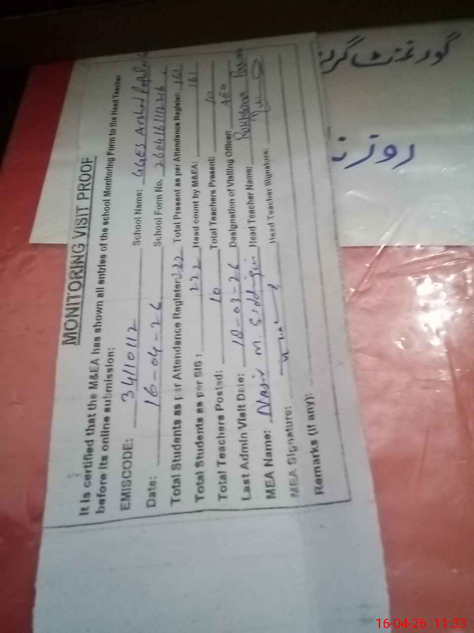 | Attendance Register | Head Teacher | MEA with School | Visit Proof |
