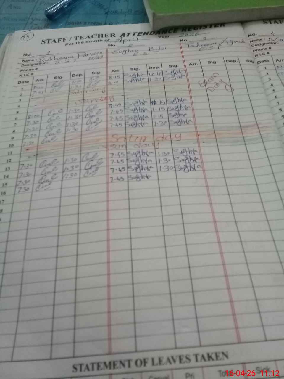 | 34**** | Ta**** Ay**** | EST Urdu | Regular | 0 | 0 | 0 | 0 | 0 | 0 | 0 | 0 | 0 | Exam Duty |