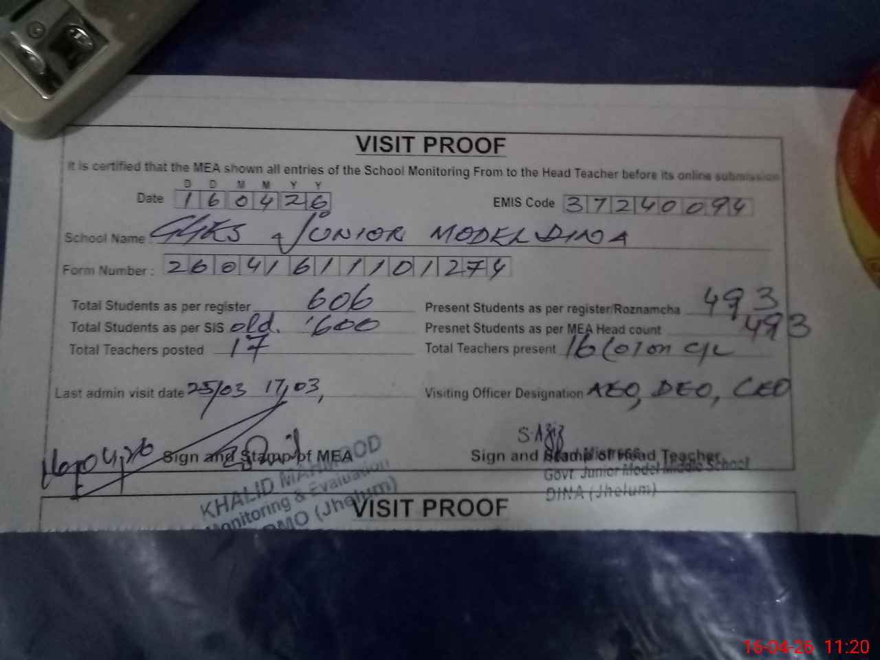 | Certified that this School was Inspected by the Undersigned MEA/DMO Today and the Information Stated Above is as Per Record. | |||||
