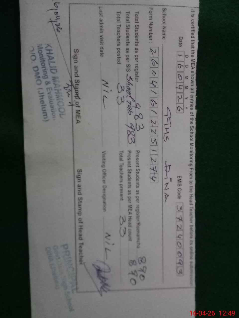 | Certified that this School was Inspected by the Undersigned MEA/DMO Today and the Information Stated Above is as Per Record. | |||||