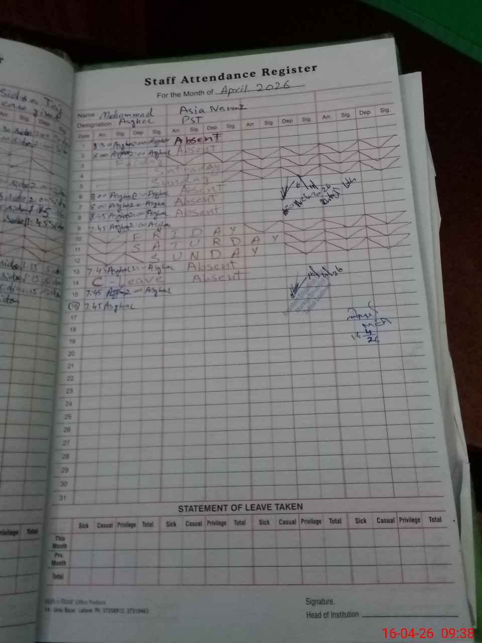 | 61**** | Iq**** Ay**** Ra**** | PST Science/Maths | Regular | 0 | 0 | 0 | 0 | 0 | 0 | 0 | 0 | 0 | Exam Duty |