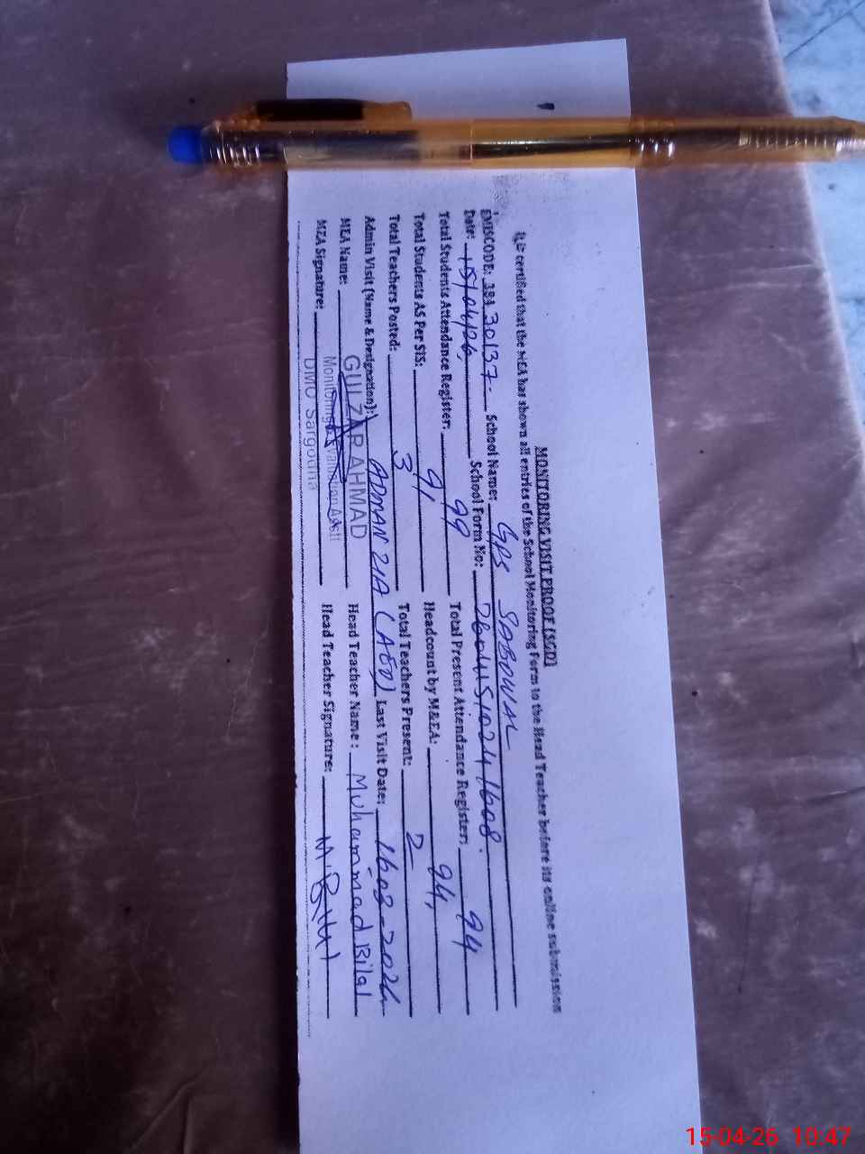 | Attendance Register | Head Teacher | MEA with School | Visit Proof |