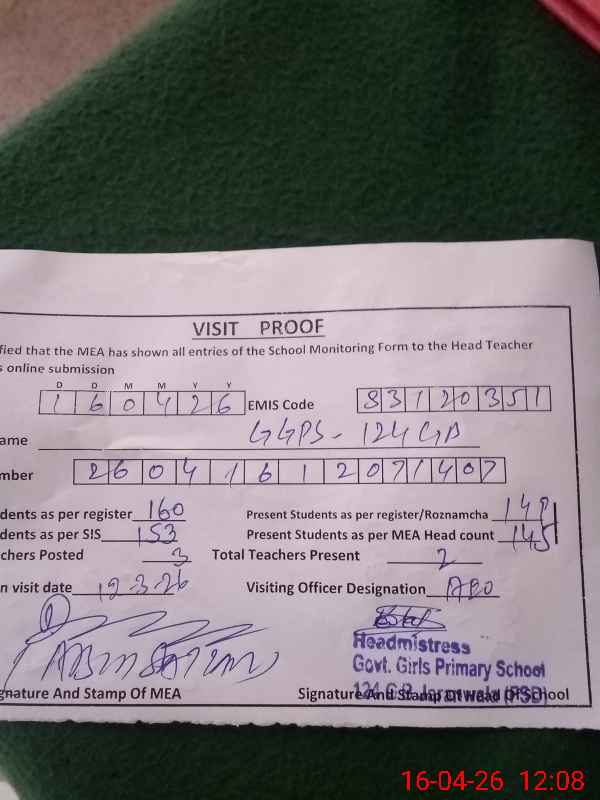 | Attendance Register | Head Teacher | MEA with School | Visit Proof |