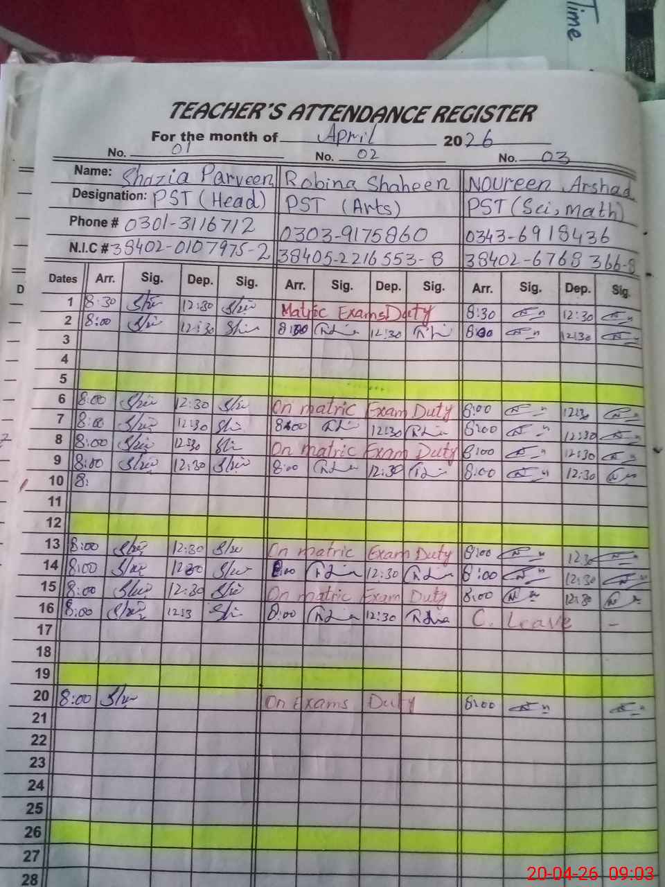 | 38**** | Ro**** Sh**** | PST Arts | Regular | 0 | 0 | 0 | 0 | 0 | 0 | 0 | 0 | 0 | Exam Duty |