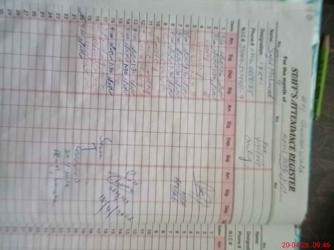 | CNIC | Full Name | Designation | R/C | Absence During Last Calender Month |