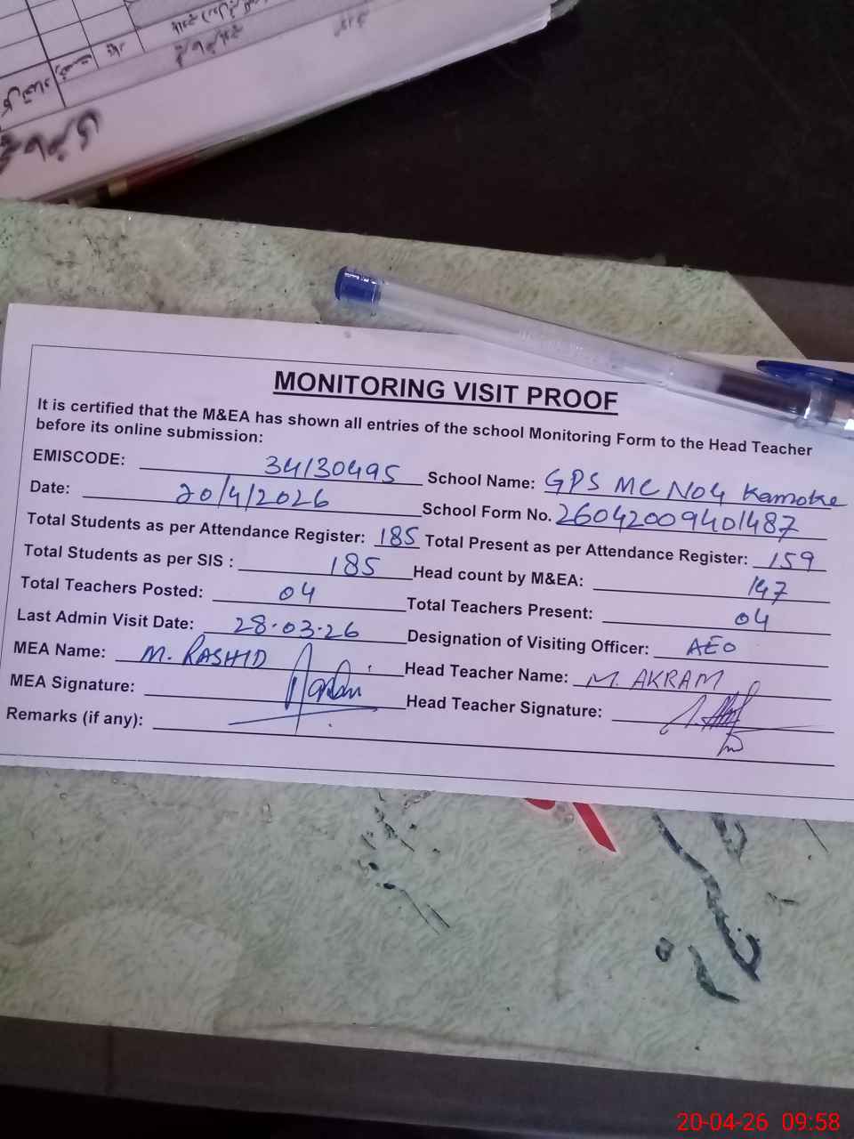 | Attendance Register | Head Teacher | MEA with School | Visit Proof |