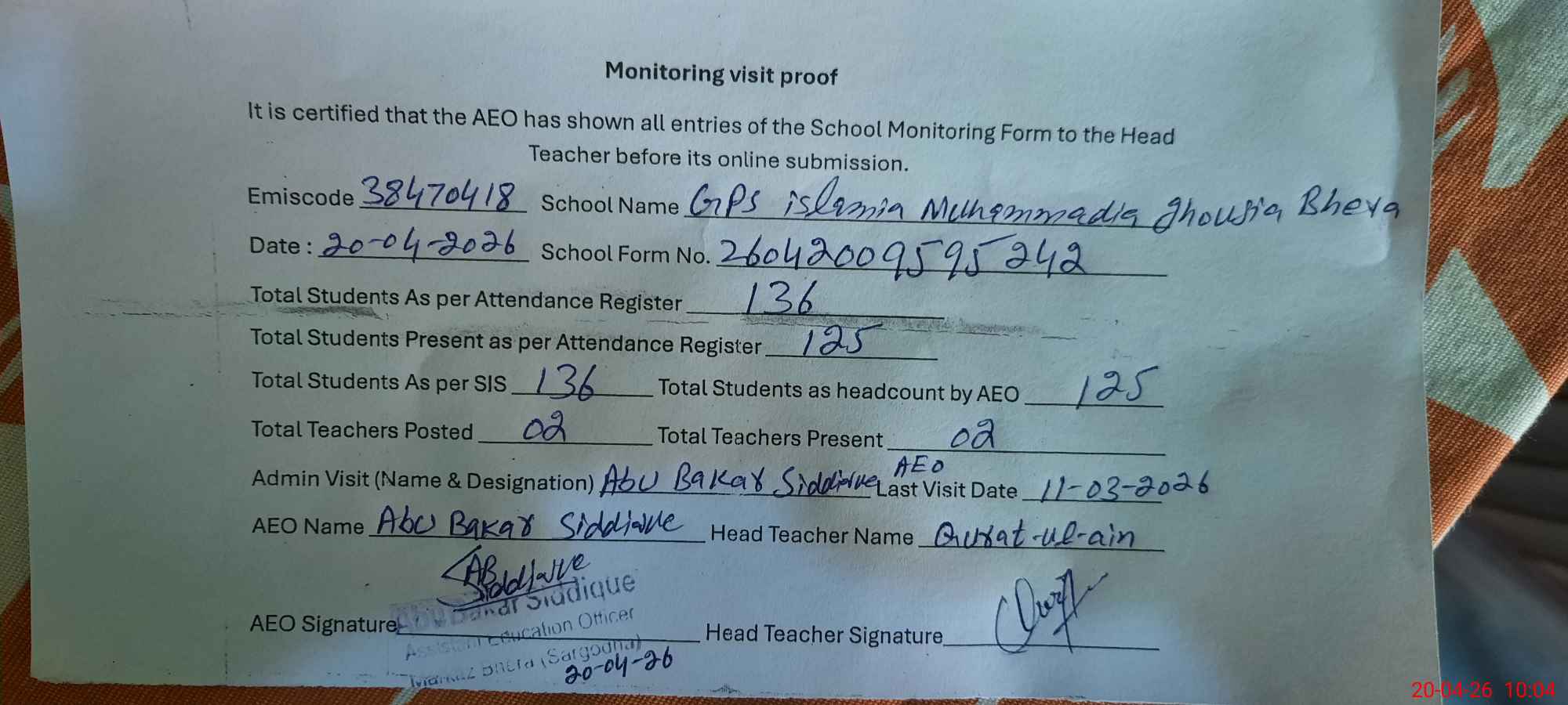 | EMIS Code: 38470418 | Name of School: GPS ISLAMIA MUHAMMADIA GHOUSIA BHERA | |||