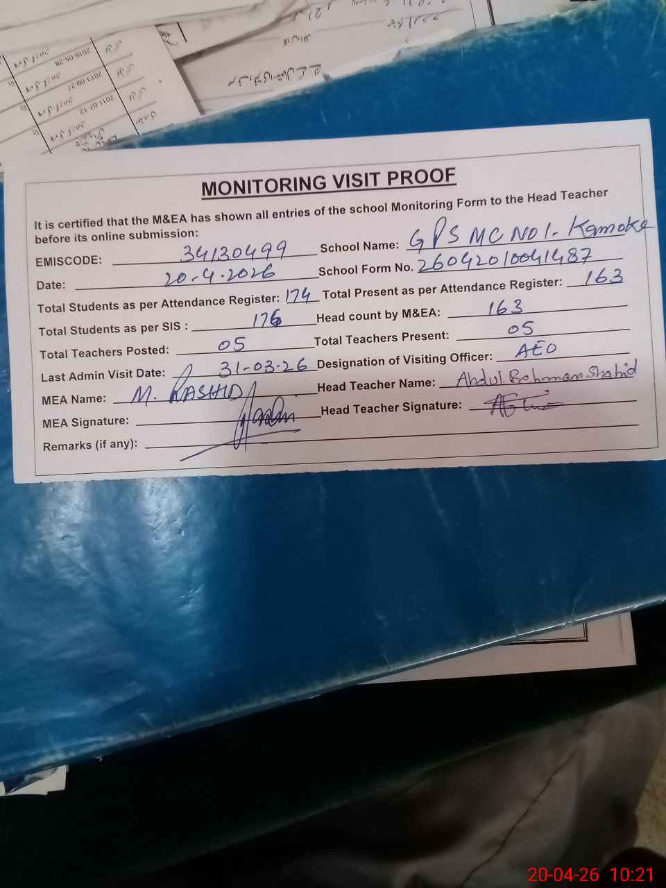| Attendance Register | Head Teacher | MEA with School | Visit Proof |