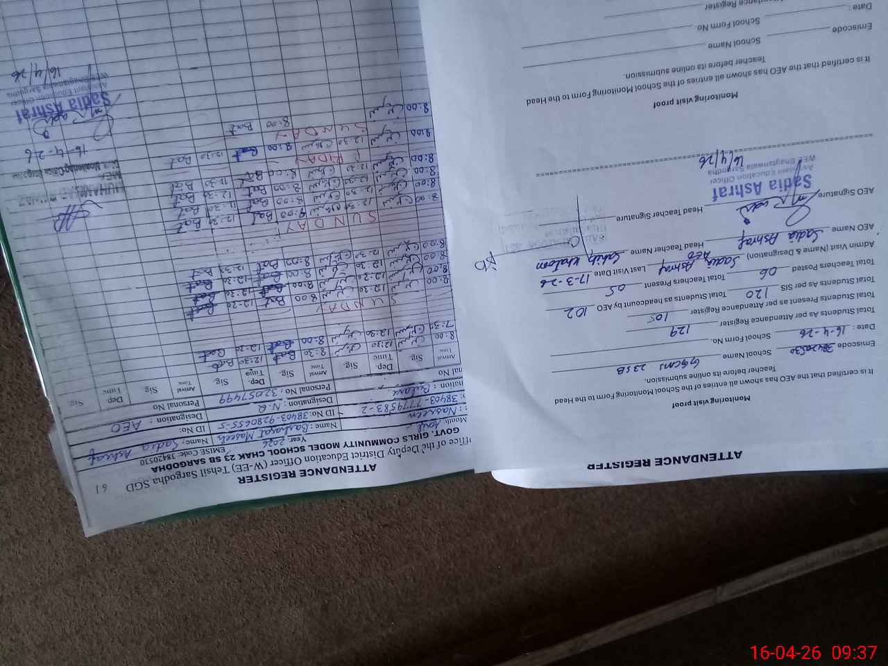 | Attendance Register | Head Teacher | MEA with School | Visit Proof |