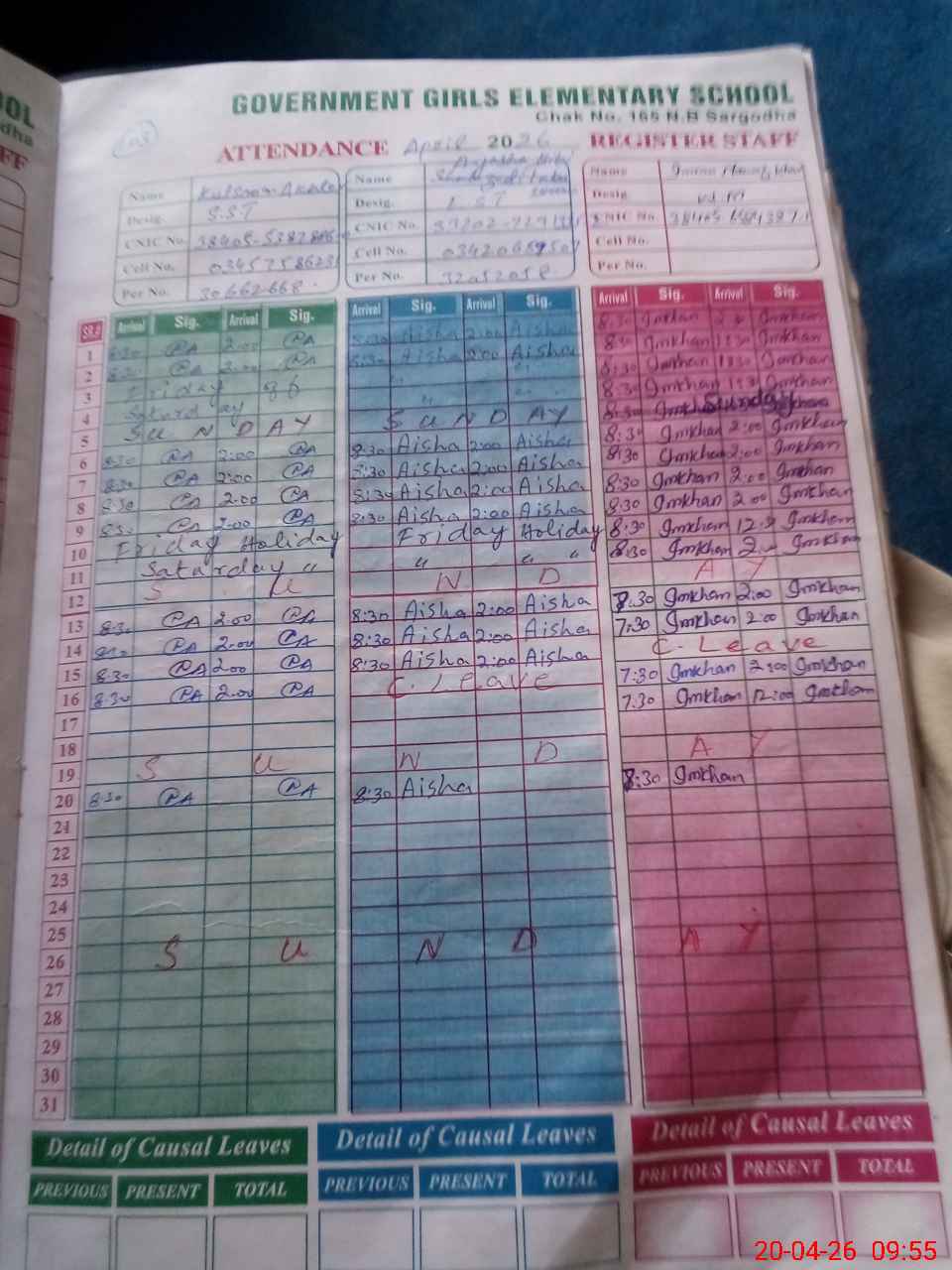 | CNIC | Full Name | Designation | R/C | Absence During Last Calender Month |
