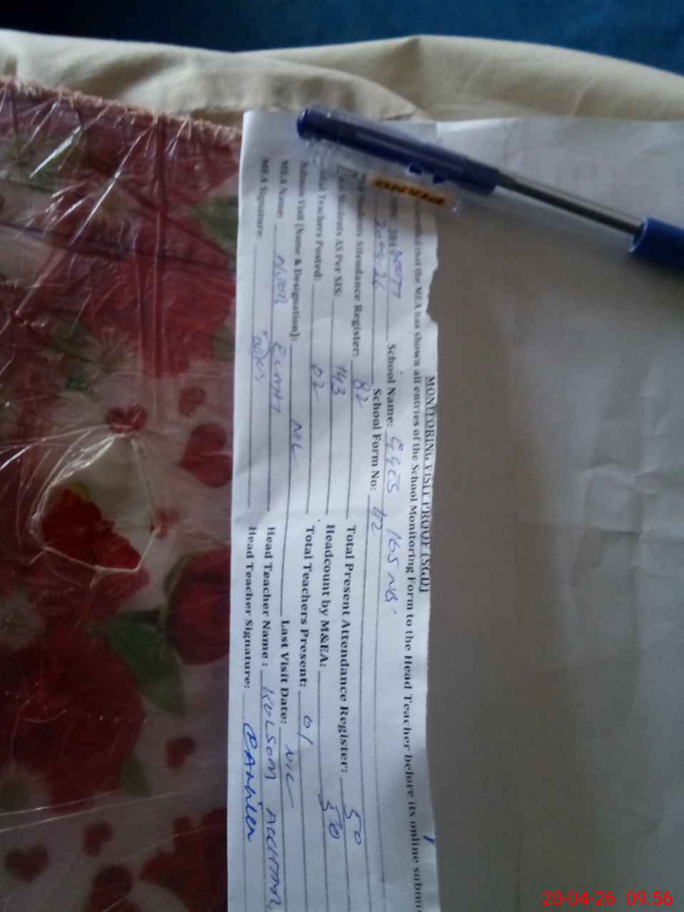 | Attendance Register | Head Teacher | MEA with School | Visit Proof |