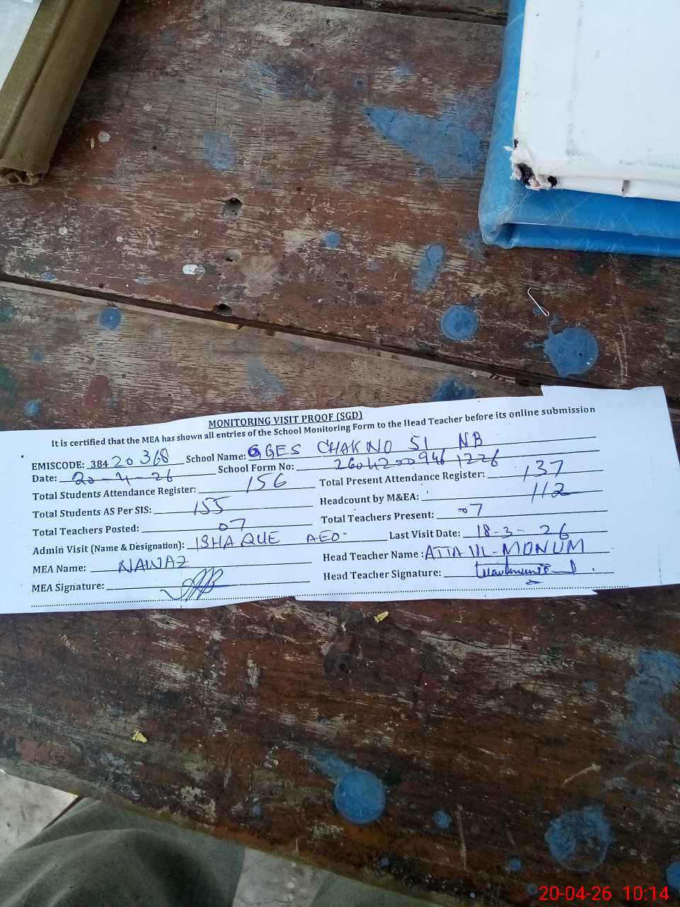 | Attendance Register | Head Teacher | MEA with School | Visit Proof |