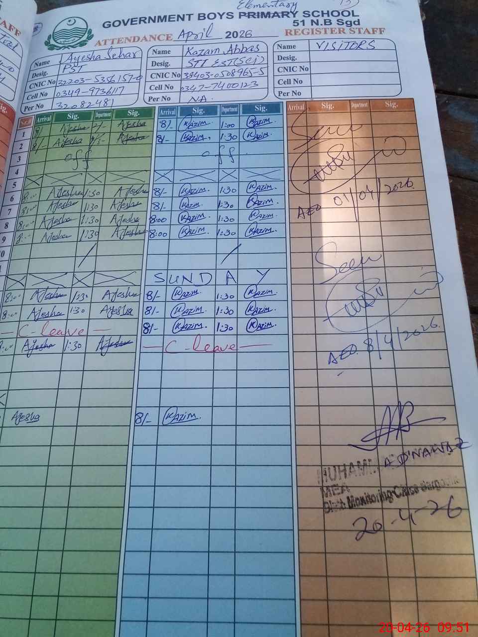 | CNIC | Full Name | Designation | R/C | Absence During Last Calender Month |