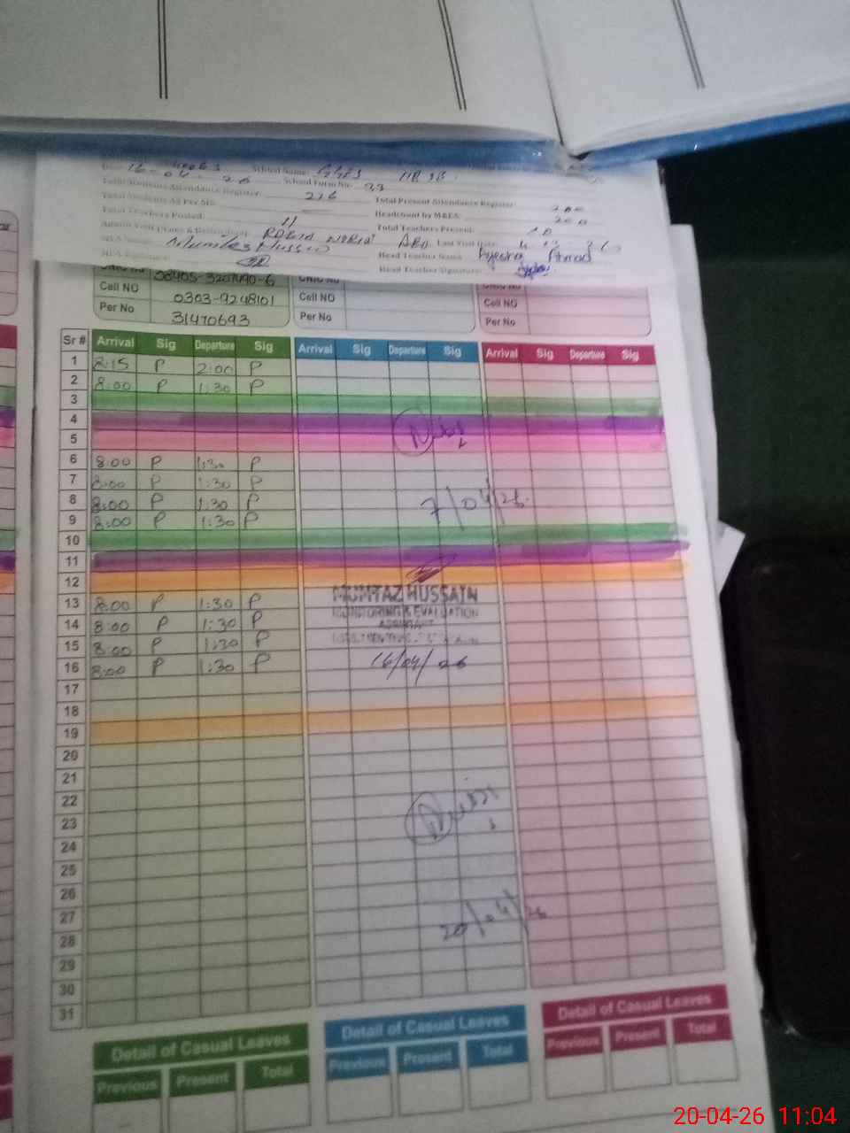 | Attendance Register | Head Teacher | MEA with School | Visit Proof |