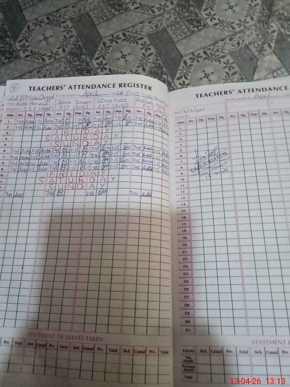 | Attendance Register | Head Teacher | MEA with School | Visit Proof |